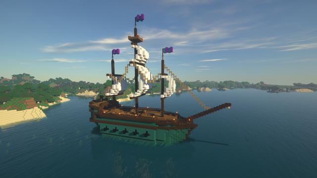 在《我的世界》原版生存中,虽然没有可以航行的多方块结构的船,但却也不影响玩家设计关于“船”的建筑。一搜停泊在海岸线附近的“海盗船”,而船体内部也零有玄机,岸边的水比较浅,船体的下方搭建了通往地底的“秘密通道”,这样玩家就可以直接在船上生存,然后需要大量空间的建筑,直接放在海底!