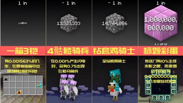粉红羊一直被冠以为“欧皇质检器”,就因为它比较稀有——自然生成率只有0.164%,换句话来说,610只羊里面才有1只是粉色的,但在Minecraft的众多低概率发生事件中,它仅仅是排在倒数第七。