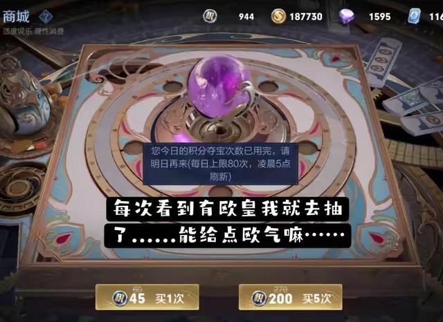 可能有玩家说自己感觉被官方针对了,因为自己每一次抽取荣耀水晶都要361次,这个时候其他玩家会说了,你以为你自己是谁呀?官方知道你是谁呀?怎么可能真针对你呢?