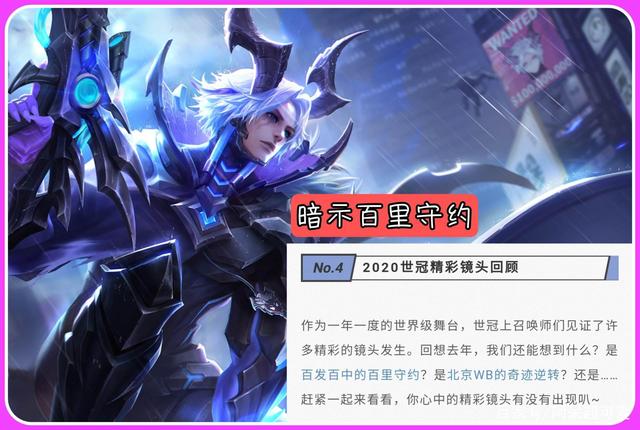 但是最近官方公布世冠皮肤的时候,就提到了百里守约在世冠比赛中的高光时刻,这也意味着官方有可能在暗示这款皮肤。