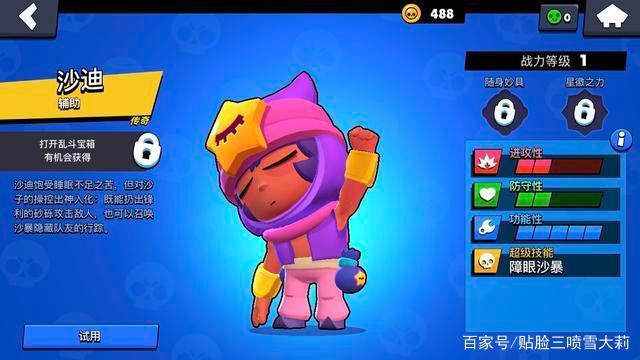 而沙迪的大招障眼沙暴才是他的核心所在,可以召唤出沙暴隐藏范围内的队友,形成敌在明我在暗的战局,是一个在3V3模式中超强的技能。另外沙迪还可以将随身妙具睡眠仪和大招配合使用,快速恢复自己的生命值。