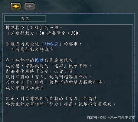 流言会使敌方城里的治安会下降到惨不忍睹的程度,不仅征兵难度大增,而且还极大的影响到敌方城池的收入。