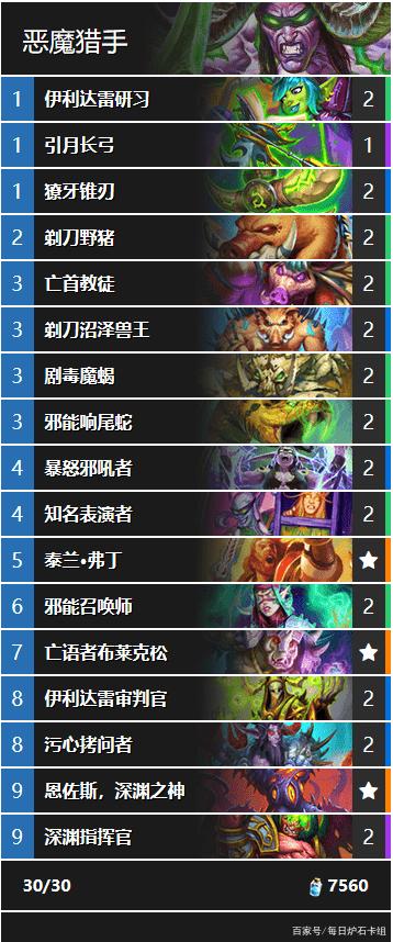 -除了将暴怒邪吼者满编,恶魔瞎在伊利达雷审判官的基础上引入了更多的大型恶魔。包括恶魔瞎的核心大哥深渊指挥官,哀嚎洞穴新卡污心拷问者。三位恶魔大哥都非常强,审判官不用说,绝对的输出核心,被踢两脚的都死了;深渊指挥官压场属于必解嘲讽,拉怪一生二威胁太大;污心拷问者对法师,盗贼都非常好用。