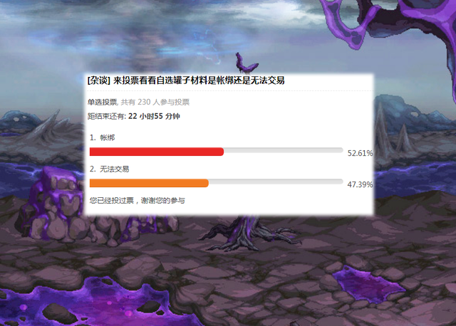 赶进度的勇士和已经毕业的玩家双方争议不断,而Colg也有1个关于礼盒的投票,想要账绑和无法交易礼盒的2个阵营,几乎是55对半分的情况。因此梅尔文可能会在22号更新的时候进行调整,起码数量要修改一下,不然2个太少了。