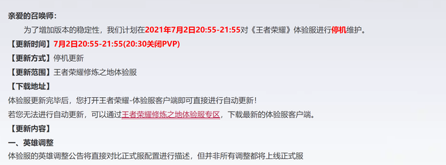 01《王者荣耀》7月2日体验服更新。——
