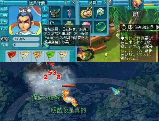 上面是一位打图党,不过上面这位打图党应该是现在所有打图党中做的准备最全面的,因为上面的这位打图党给自己弄了五件海毛虫的变身套装,这样进入战斗就会变身为海毛虫,而海毛虫的攻击时的动画时间是比较短的,所以上面的这位玩家在打宝图任务中的每场战斗都要比别人节省一点点的点卡成本。