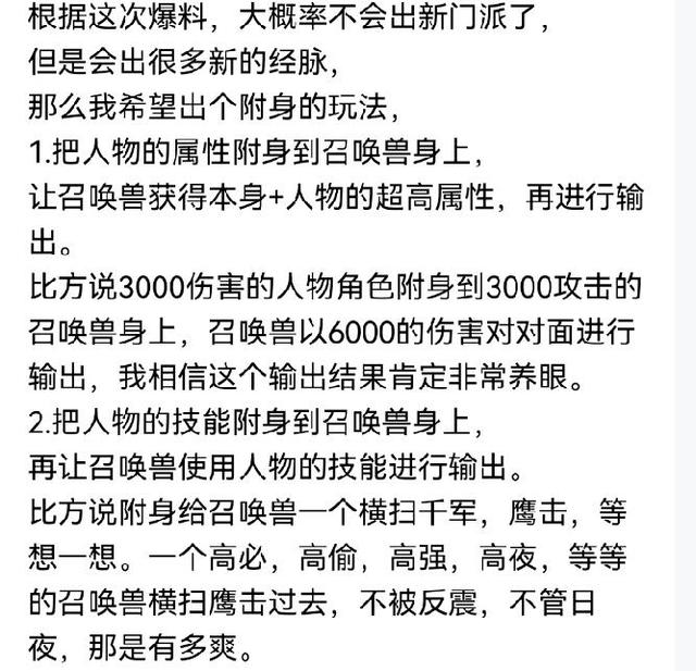 虽说现在已经上限了一个新资料片,只不过这个新资料片是限时资料片,可以将它看成一个新的任务系统,对于每年会上线的一个对梦幻有深远影响的资料片,策划所透露出来的消息还是比较少的,而有的玩家表示策划不可能上线新的门派了,但是会在现有门派的基础上进行经脉的更改,就比如上面这位玩家说的玩法,一个是把人物的属性附加到召唤兽身上,另外一个是把人物的技能附加到召唤兽身上。