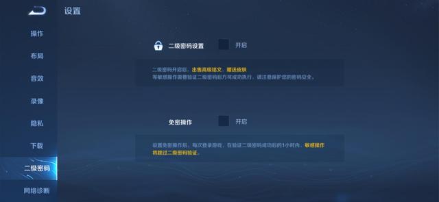 其次就是如果真要选择出租账号,则必须要设置二级密码,二级密码的作用咋是为了针对于一些高级资源和货币的使用,以及赠送皮肤之时所需要输入相应的操作密码方可实现,这对于租号者本身有着很大的保障作用,以防止某些小人玩家暗渡陈仓。
