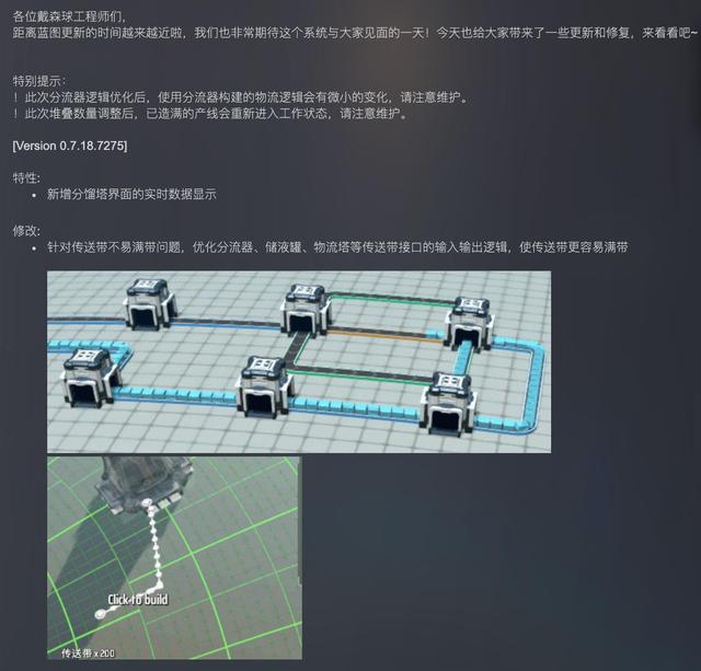 《戴森球计划》于近日上线了0.7.18.7275版本更新,官方同时在Steam和微博上分享了这次的更新日志,根据介绍可知,本次更新增添了分馏塔界面的实时数据显示、优化了传送带接口的输入输出逻辑、进行了平衡性调整并修复了几个BUG。