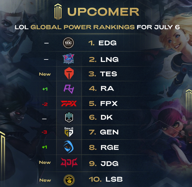 首先前两名还是EDG与LNG稳坐第一第二,而TES也是久违的重新进入到了第三,RA则是凭借出色的发挥排在第四,FPX因为输给了IG所以下降了两名排到了第五,自从全球战力榜前五都是LPL的,这也是今年最好的排名了,剩下则是第六名的DK、第七名的GEN、第八名的RGE和新加入的第九名JDG与第十名的LSB。