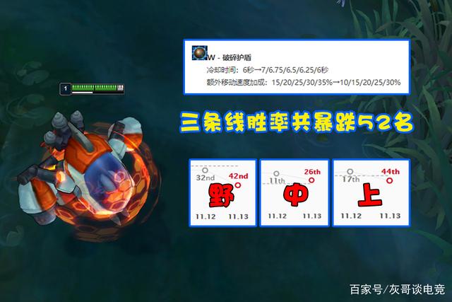 于是设计师在11.13版本中再次对兰博“动了刀”,这回他们转变了思路,把削弱方向转移到了W技能破碎护盾上,由于所有位置的兰博基本都是主Q副E的,所以设计师将W技能的冷却时间从6秒调整至7/6.75/6.5/6.25/6秒,降低了前中期强度,并且每级的额外移速加成下调了5%,这次“手术”的效果非常好,兰博的胜率一夜暴跌,打野位下滑了10名、中路下滑了15名、上路更是下滑了27名!直接宣布报废。