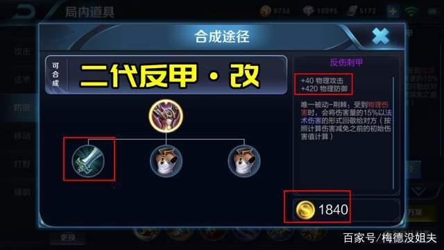 或许是因为二代目反甲太过强势,因此在版本更新中他也被魔改数波,其中最有代表性的便是下图所示的这一款——合成路径由风暴巨剑改为了雷鸣刃、攻击力加成由80下降至40;价格从2140下降至1840金币、荆棘被动效果从20%降低至15%、物抗加成则从360提升至420。