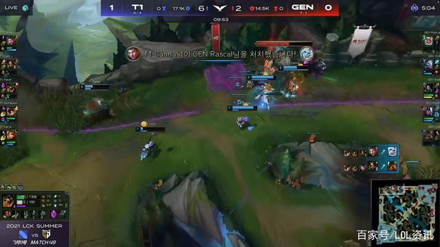 这场比赛Faker选到了鳄鱼,非常难得,而打野Cuzz则是选出豹女,这对中野组合在LCK赛区中有着零胜率的魔咒,之前一些队伍选到这队组合时都被观众们骂头铁,但T1这场比赛则是通过鳄鱼和豹女这队组合在前期打出了优势,8分钟先锋团Faker鳄鱼连续收割人头,长达1分钟的团战Gen被打得溃不成军。