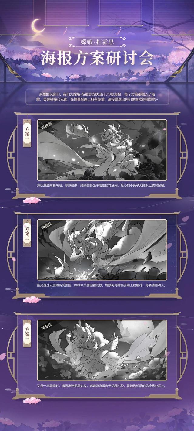 之前的一些皮肤重做都是两种方案供玩家选择,而这一次嫦娥的源梦皮肤拒霜思直接提供了三种海报方案,而且每一种方案场景都是不一样的,由全民玩家进行参与,共同创作源梦皮肤,而且每一款源梦皮肤的海报制作都是非常漂亮和经典的,而这一次这三款海报图都是非常漂亮,在投票结束之后,最终的归属就是这款皮肤的海报图了。