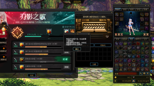 把材料背包栏拉满,并且把刃影徽章放到个人仓库里,此时分解活动史诗是失败的,但是同样计入分解活动装备次数。