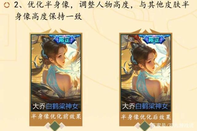 第二个就是大乔白鹤梁神女的半身像位置的调整。在大乔半身像刚出炉的时候,大乔半身像位置太上了,和其他皮肤的半身像不平齐,所以这次优化就优化了半身像的位置。