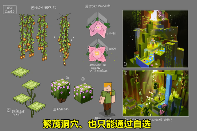 繁茂洞穴本来是第一部分最让人期待的洞穴之一,而且加入之后确实得到了不少好评,给玩家打造了一个在地底也宛如地面的场景。在繁茂洞穴中有着各种各样的植物和食物,洞穴藤蔓、杜鹃花、发光浆果等都是在繁茂洞穴生长的。但很可惜,不知道什么原因,繁茂洞穴在正式版中也被Mojang给移除了,现在只能通过自选世界才可以看到繁茂洞穴。