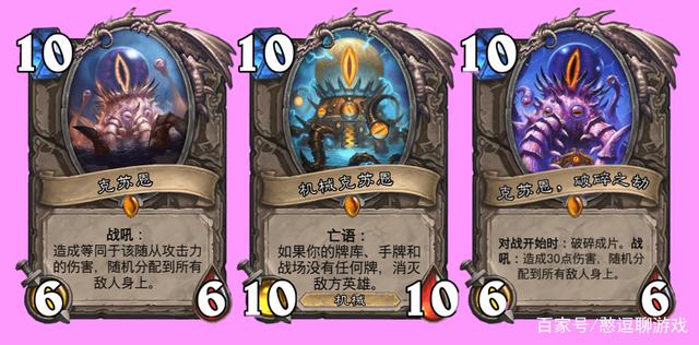 每一个版本的克苏恩都是让登场即胜利的怪物,这才是十费卡该有的强度。老克苏恩人手一张,想要把它养到二三十攻,要带的朴实无华工具人太多。机械克苏恩是炉石第二张能直接胜利的卡,比骑士DK泛用。新克苏恩就算了,主玩快攻的憨逗从来没看过它出场。