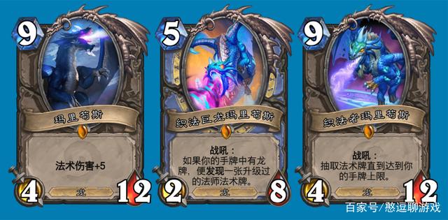 魔法的化身大蓝龙,气宗OTK核心,非常限制构筑的卡,反复徘徊在荣誉室门前还是没进,现在主要是德鲁伊用。织法巨龙身材缩水,3选1很灵活,系统随机8选3就看脸了,可用但不强。核心蓝龙在目前的环境里广泛应用于各种厚度卡组。