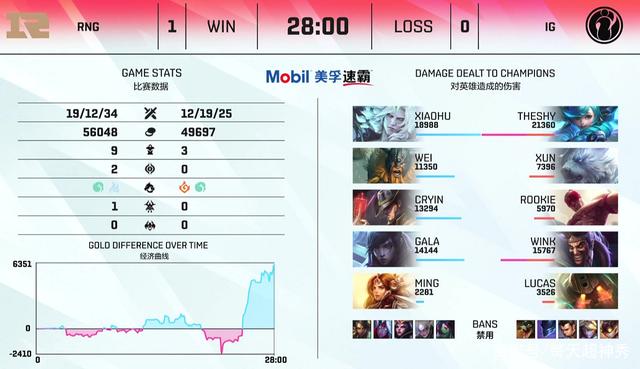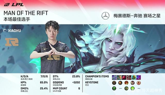游戏开始,峡谷先锋刷新,RNG与IG在上路河道爆发正面交锋,小明瑟提配合小虎佛耶戈切割战场,站位脱节的IG溃败。这波团战过后,RNG持续扩大经济差距,最终在30分钟内终结比赛,MVP再次给到小虎佛耶戈,面对Theshy格温,小虎打出了超过5200的对位经济差,7-0-6的伪超神KDA,足以说明小虎佛耶戈有多么强大。