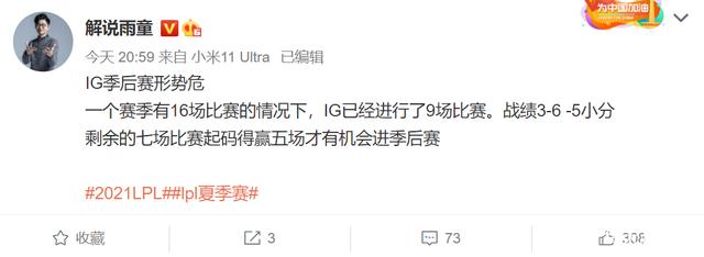 IG或止步常规赛?被RNG横扫,输掉LPL电竞春晚后,IG战绩下滑至3胜6负,至今没能进入积分榜前十,这意味着IG难回世界赛舞台!对此LPL解说雨童带来坏消息:IG季后赛形势不容乐观,必须赢下后续七场BO3常规赛中的五场,IG才有晋级季后赛的理论可能性。