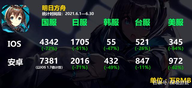 先说为什么会出现跌幅,原因很简单,因为5月份可是明日方舟非常有重大代表意义的周年庆活动,这个可以说直接把氪金流水冲到全新的境界和地步,所以6月份出现大幅度的跌幅很正常,毕竟周年庆的活动和骗氪能力是日常不能比的,所以72%的跌幅是因为五月周年庆涨了足足有440%,回落属于正常现象,环比才有价值。