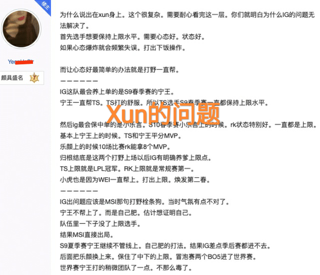 首先,他认为ig战队目前存在,的主要问题就是选手的状态。线上的每一名选手都有着上限和下限,而且差距非常大,一旦状态发挥不好,就会直接崩盘,The shy和rookie是非常强的选手,但是弱的时候也会成为送头混子。如果他们无法调整状态的话,IG战队今年的季后赛是没有任何可能的。并且主教练no fe认为目前比赛中问题最大的就是xun,他的打法太注重个人,没有团队的付出,而一个打野选手在比赛中是很难掌控住局势的。