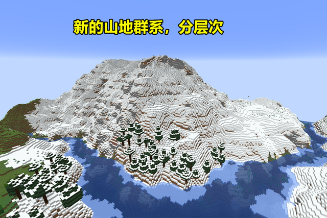 进入游戏,一座崭新的山地出现在我眼前,这是此前在基岩版更新过的新的山地群系。整座山地分为不同的层次,雪坡、草地、树林、雪峰、高山峰,让人看起来十分舒坦,也更加具有挑战性。