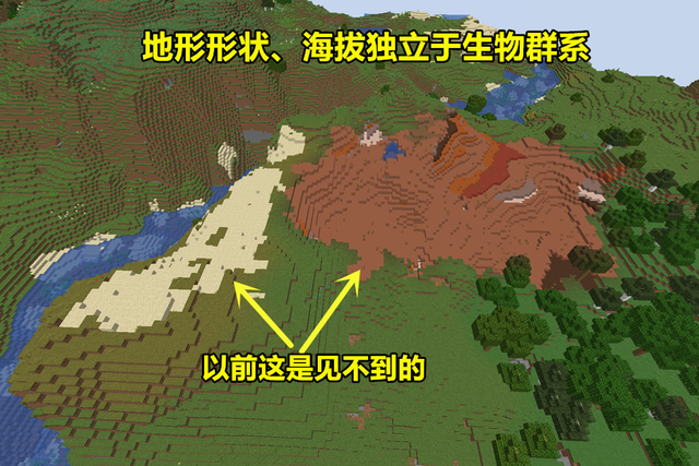 关于这一条的描述刚开始迷恋是不太明白的,但后来查询了一下得知生物群系和地形海拔都是相关联的,什么样的地形和海拔实际上就决定了什么样的生物群系。而在这一次的更新中,地形、海拔都和生物群系相互独立。举个简单的例子,比如以前沙漠只能在平地生成,现在即便是山上,沙漠也是可以生成的。