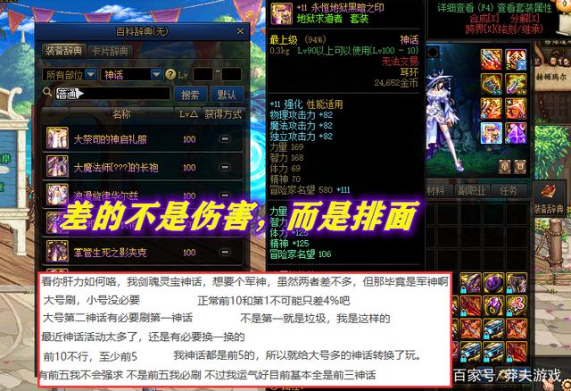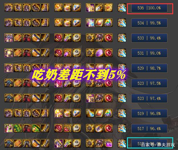 以剑魂为例,希洛克毕业后吃奶状态下,“军神”排名第1位,而排名第10位的是“大幽魂手镯”,可见双方差距不到5%!而且这还是第10和第1的对比,实际游戏中,大家拥有的可能是第5、第7神话,那么中间差距就更小了。