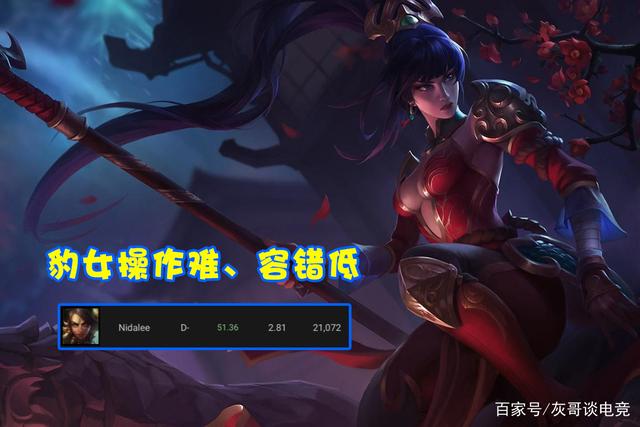接下来是豹女,豹女登上“废人榜”的原因主要有两个,其一是因为操作难度过高,会用其打野的玩家少之又少,而线上豹女的强度又比较一般;其二是因为豹女的大部分伤害需要印记才能触发,除了冰女和艾希大招之外好像就没有一个能与之匹配的了,再加上身板又比较脆,抽到刺客大招又不敢跳战士的脸,抽到控制大招贴身放又容易被秒,容错率很低不适合一般玩家。