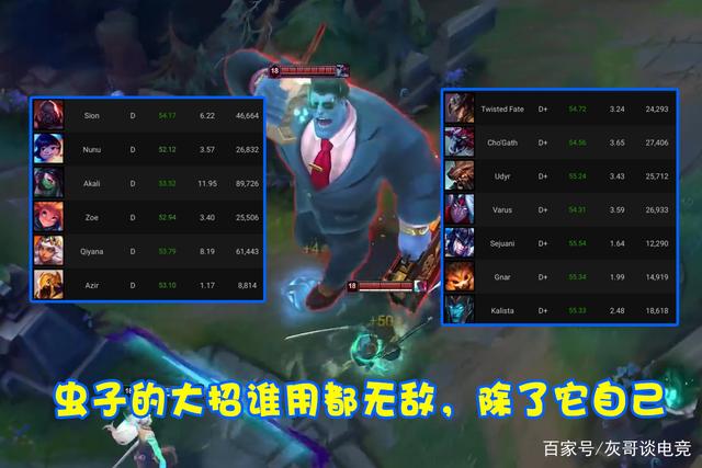 第二个特征就是自身没有位移且缺少伤害,比如塞恩、大虫子、卡牌、乌迪尔等,这些英雄不论拿到多强的大招也无法改变它们的工具人属性,输赢纯看队友,单排的情况下尽量远离这些英雄。