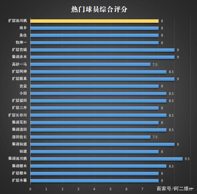 扩层流川枫的综合强度的确是有一定的提升,不过至于提升了多少,维一想还是要根据大家的熟练度来评判,总体上维一给到扩层流川枫的综合评分是8分,在目前所有热门球员的水平大概如下图所示