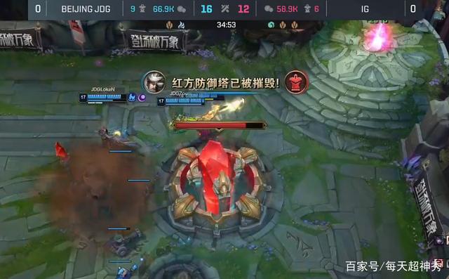 凭借装备和阵容优势,JDG全员进攻IG高地,LokeN厄斐琉斯毫无输出压力,在锤石和盲僧的保护下打出满额输出,由JDG是击杀IG四位队员后,一波推平敌方基地水晶,在前中期占优势的情况下,IG被JDG击溃。