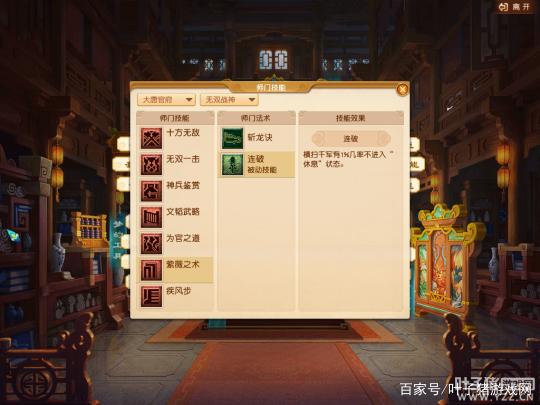【无双战神】师门技能【紫薇之术】新增被动师门法术【连破】,其效果为横扫千军1%几率不进入“休息”状态。