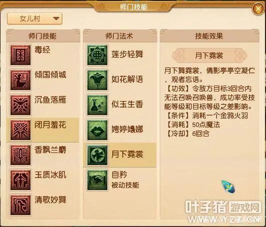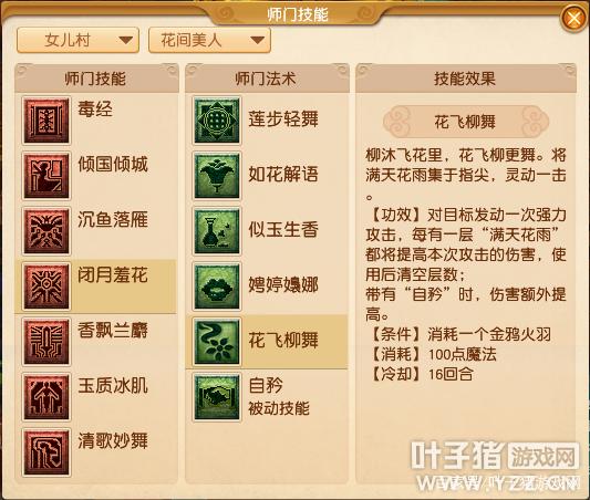 【花间美人】师门技能【闭月羞花】减少师门法术【月下霓裳】,增加师门法术【花飞柳舞】。