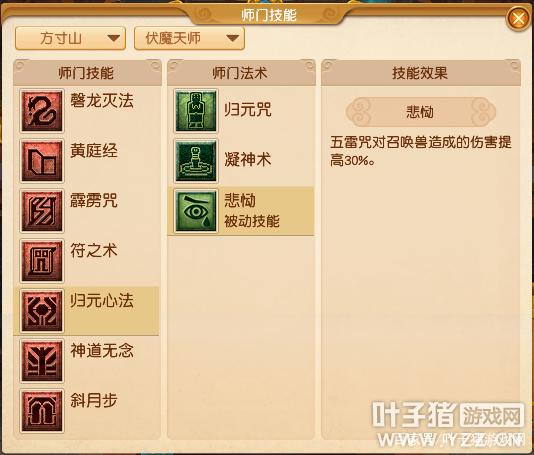 分为【伏魔天师】、【拘灵散修】、【五雷正宗】三个流派。【拘灵散修】流派与前无异。【伏魔天师】流派的师门技能【归元心法】新增被动师门法术【悲恸】,其技能效果为五雷咒对召唤兽造成的伤害提高30%。