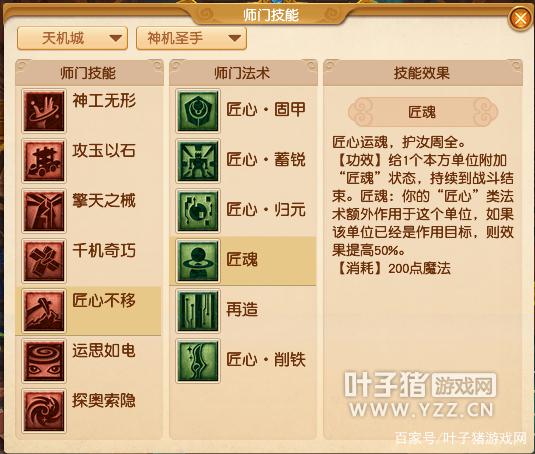 匠心运魂,护汝周全。【功效】给1个本方单位附加“匠魂”状态,持续到战斗结束。匠魂:你的“匠心”类法术额外作用于这个单位,如果该单位已经是作用目标,则效果提高50%。【消耗】200点魔法【匠心·归元】技能效果: