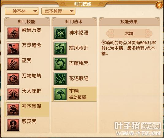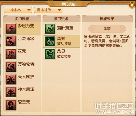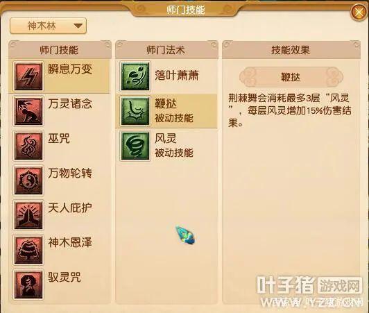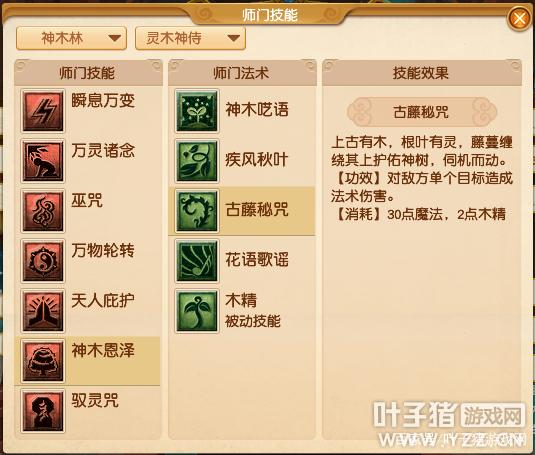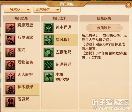 分为【灵木神侍】、【通天法王】、【巫影祭师】三个流派。【灵木神侍】【神木恩泽】新增师门法术【疾风秋叶】、【古藤秘咒】以及被动技能【木精】【疾风秋叶】技能效果: