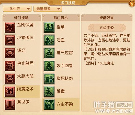 【六尘不染】技能效果:六尘不染,五蕴皆空。唯有排除外欲,方能心地洁净,更助活气化血。【功效】移除自身所有增益效果,每个增益效果回复自身一定气血。【消耗】100点魔法同时在【小乘佛法】一栏减少【聚气】、【明光】两个技能,增加被动技能【度厄】。【度厄】技能效果:你的叽叽歪歪和谆谆不悔不会触发法术闪避,但门派法术施加的治疗和“金刚护体、金刚护法、一苇渡江”效果降低50% 。大唐官府
