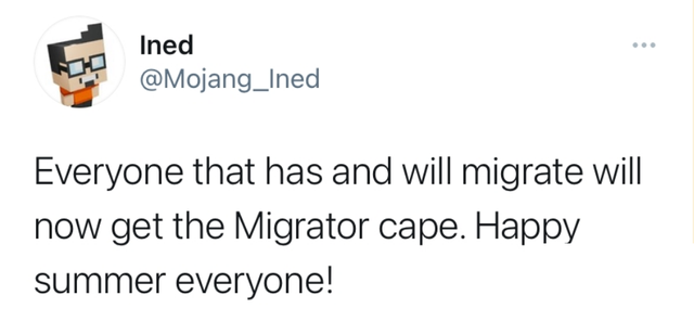 1、迁移披风已发放!一个来自Ined的公告:目前《我的世界》已经完成账号迁移的玩家,和未来即将迁移的玩家都将在迁移之后立刻获得一个披风!