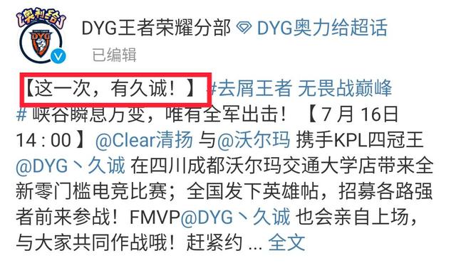 但是DYG在最近的社交平台发文中却用继续消耗久诚的人气,这一次,有久诚,乍一看我们还以为久诚要登场比赛了,仔细一看却发现只是一个商业活动,这完全就是在消费久诚,因为久诚已经明确表示,自己将会在世冠赛结束之后离开DYG。