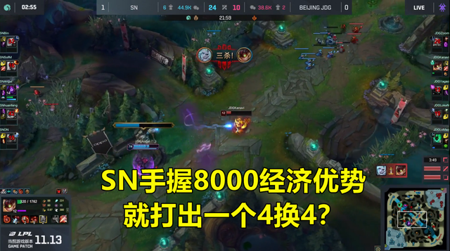 队员的沟通在很短时间内可以完成,这也是队伍磨合不错的印证,并且SN在野区抓单、前期团战的处理非常细节,几波单抓JDG掉点后很果断的开启小龙团,打出0换3后敲定胜势,接连拿下两条大龙+入侵野区已经将雪球滚到近7000的经济差。