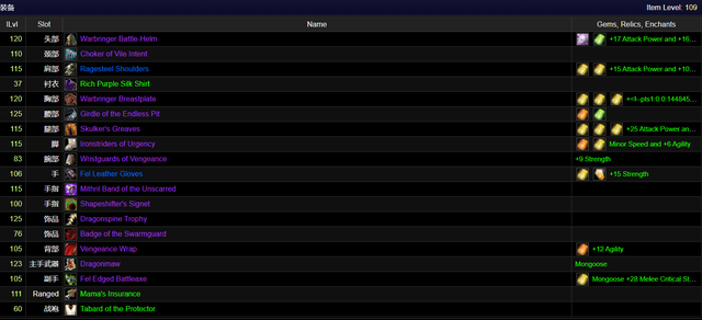 有的玩家还会担心狂暴战会变成像经典旧世一样的氪金无底洞,有趣的是狂暴战在目前阶段的装备门槛也不高,BIS装中甚至还有两件绿装。