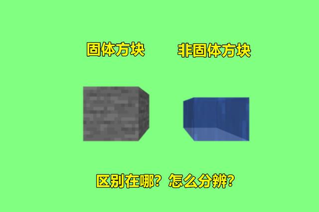大家其实可能都知道什么是固体方块,但是却不知道如何去描述,更不知道如何去区分。其实很简单的,简单来说就是,玩家、生物或者其他实体无法通过的方块就是固体方块,比如石头、树叶等,而玩家、实体能够通过的方块,比如水,这些就是非固体方块了。用MC专业的术语来讲就是碰撞箱,方块的碰撞箱无法被玩家或其他实体通过,那它就是固体方块了。