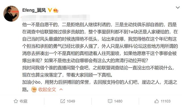 不过在这次的假赛事件当中,有一个圈内的大佬却是自始至终都站在Bo这边,不断地帮Bo说话,他就是前IG俱乐部的CEO翼风。事情曝光出来之后,翼风就不断地在解释着这件事情,在他的解释中,Bo参与假赛,一直以来都不是自愿的,而且也多次拒绝了利诱,再加上情节较轻,而且还为这次联盟的调查做出了很多贡献,所以才只禁赛4个月。