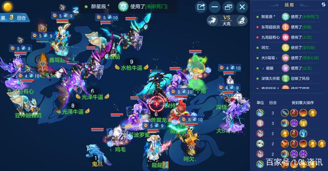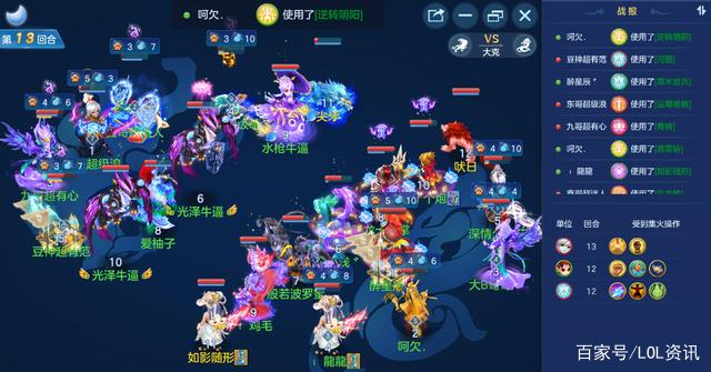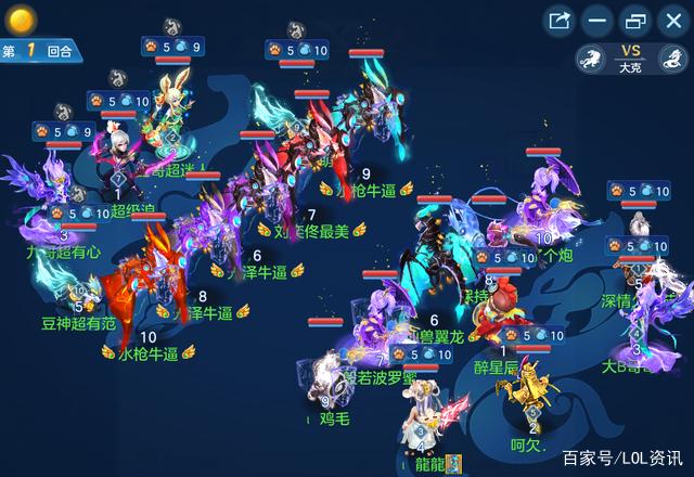 阵容方面,观战方“万木争春”队采用的是一物一法+二封一辅的阵容,天宫+武侯+方寸+盘丝+普陀。而对战方“大吉大利”则使用了双法一物+一辅一封的阵容,双武侯+天策+曜华+普陀。首发宠方面,观战方是帝火+2雨师+仙兽翼龙+龙虾骑士,对战方则是清一色的五只仙兽翼龙。阵法方面,对战方虎翼阵大克观战方龙飞阵。