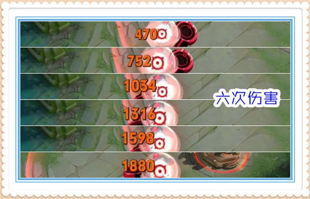我用一个六神装的典韦站在防御塔下做测试,结果防御塔前六次的伤害如上图:470、752、1034、1316、1598、1880,每次攻击会提升282点伤害,这个伤害提升在第六次攻击时达到峰值,后续并不会再增加。