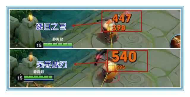 如果单纯的从伤害伤害来看的话,出无尽战刃可以将伤害提升120%,如果将伤害次数再放大的话,无尽战刃还比逐日之弓多了10%的暴击率。