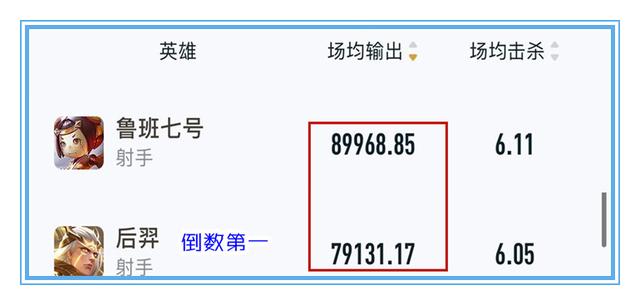 如果从官方给出的场均输出来看的话,后羿比鲁班七号差的不是一点半点。